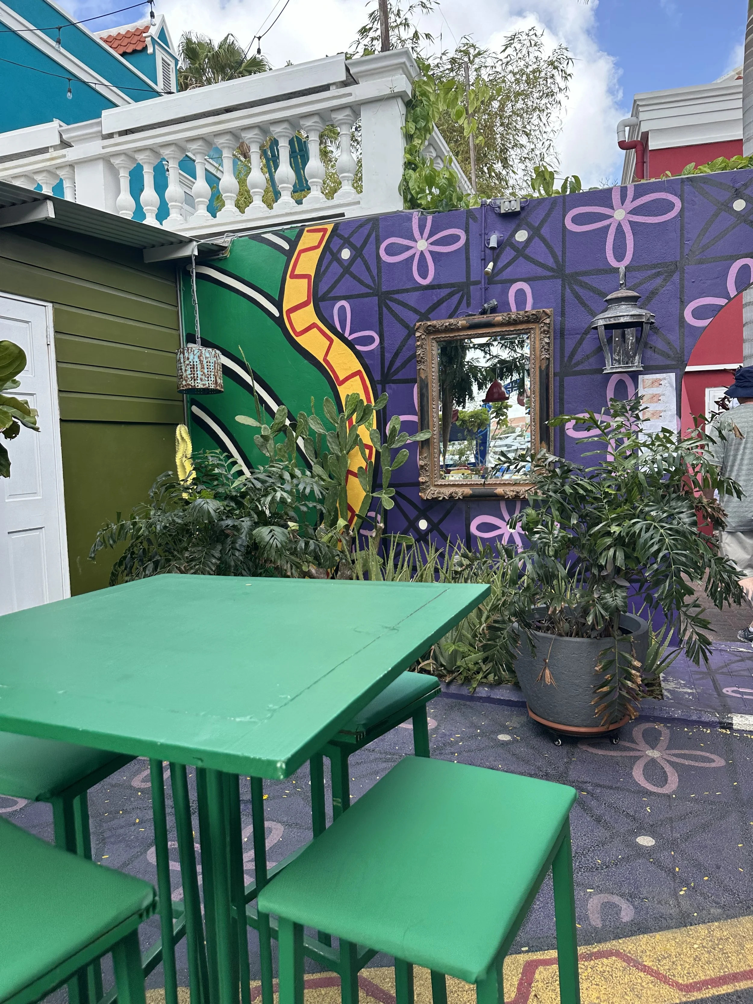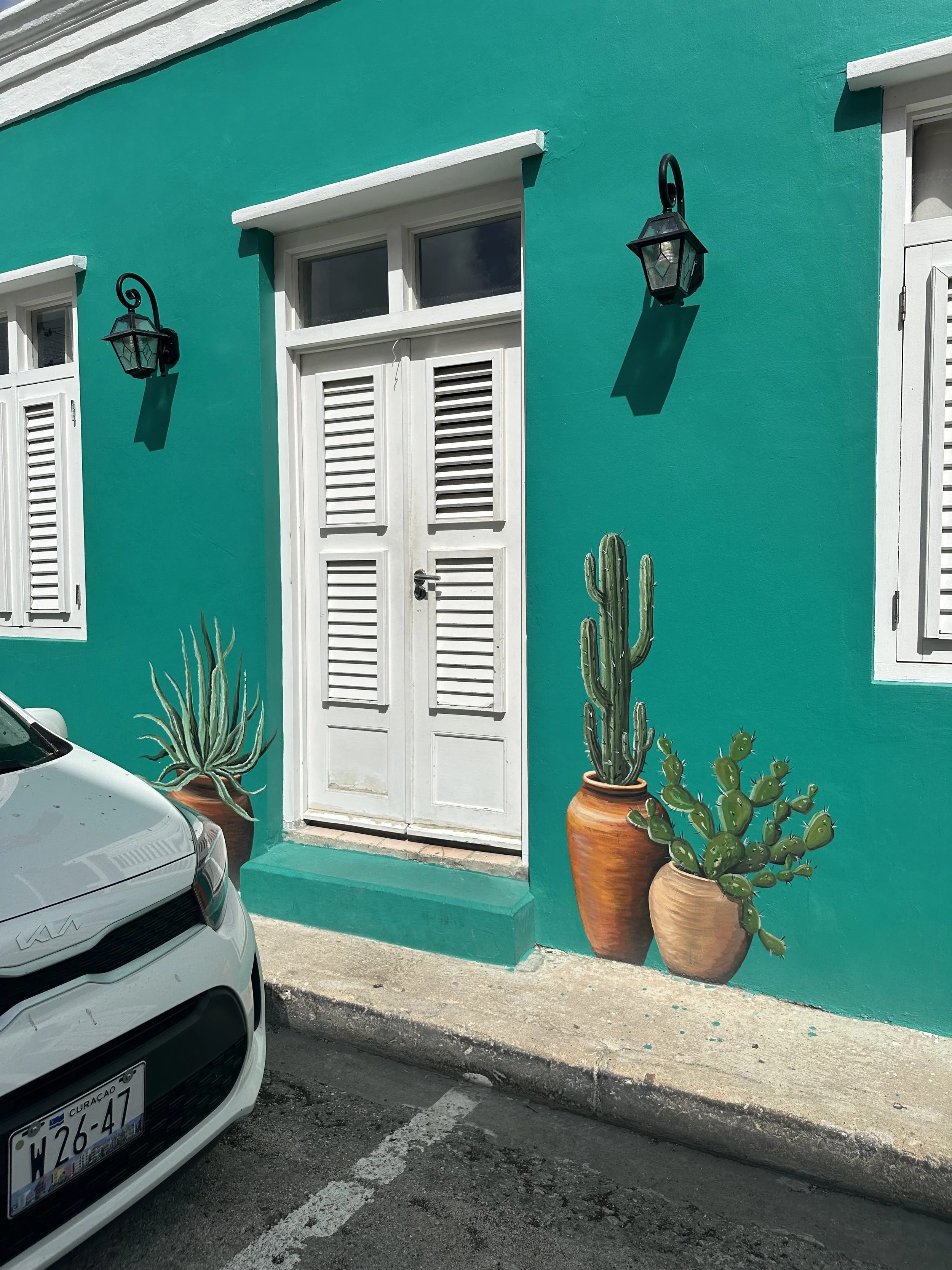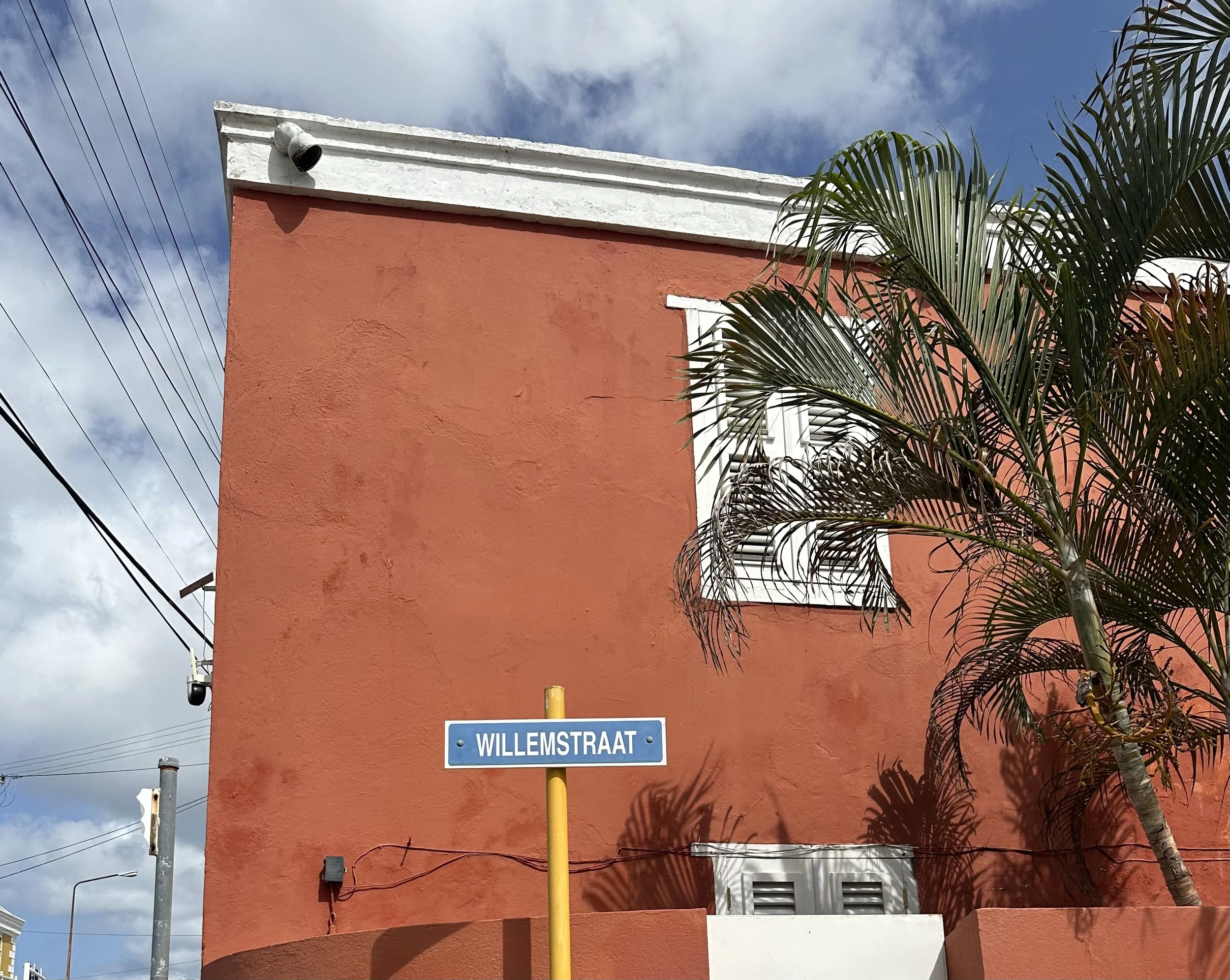 Our walking tour took us through the town of Otrabanda, known as the “other side” of the Saint Anna Bay. The street art is electrifying! The land is arid, with plant life living on the walls in vibrant paint colors! House numbers, street signs, and history are painted along the cement walls of the houses and buildings. Homes are colored in pastels of all shades. It felt like Harold (of Harold and his Magic Crayon) had arrived with an entire box of crayons to bring color to an otherwise colorless vista.